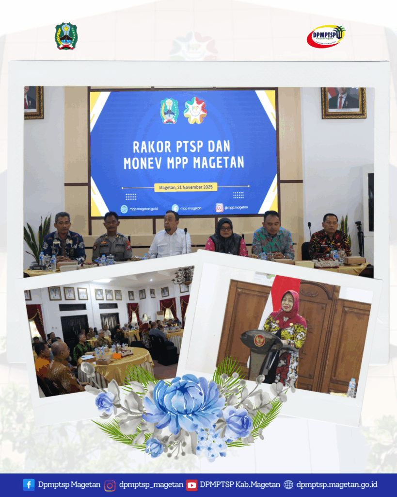 Magetan, 21 November 2025 โ€“ Dinas Penanaman Modal dan Pelayanan Terpadu Satu Pintu (DPMPTSP) Kabupaten Magetan melaksanakan Rapat Koordinasi (Rakor) dan Monitoring Evaluasi (Monev) Mal Pelayanan Publik (MPP) bertempat di lingkungan Pemerintah Kabupaten Magetan. Kegiatan ini diikuti oleh seluruh perangkat daerah dan instansi penyelenggara layanan yang tergabung dalam MPP Magetan.
