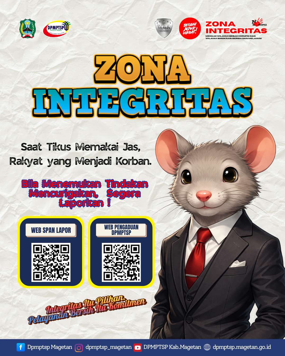 Selain itu, masyarakat juga diajak untuk berperan aktif dalam pengawasan pelayanan publik. Apabila ditemukan indikasi penyimpangan, gratifikasi, atau praktik tidak sesuai dengan ketentuan, masyarakat dapat segera melaporkan melalui kanal pengaduan resmi, baik melalui aplikasi SPAN Lapor maupun layanan pengaduan DPMPTSP Kabupaten Magetan yang telah disediakan.