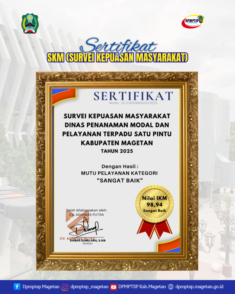 Pada Tahun 2025, DPMPTSP Kabupaten Magetan berhasil memperoleh Sertifikat Survei Kepuasan Masyarakat (SKM) dengan mutu pelayanan kategori “Sangat Baik”, berdasarkan hasil pengukuran Indeks Kepuasan Masyarakat (IKM) sebesar 98,94. Survei tersebut dilaksanakan oleh pihak independen CV Adhimas Putra sebagai bentuk evaluasi objektif terhadap kinerja pelayanan yang diberikan kepada masyarakat.
