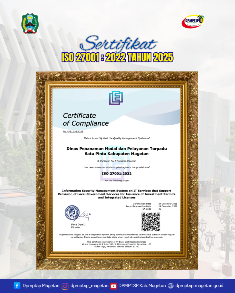 Pada tahun 2025, DPMPTSP Kabupaten Magetan meraih Sertifikasi ISO 270001:2022 Tahun 2025. Sertifikasi ini merupakan standar internasional yang mengatur Sistem Manajemen Keamanan Informasi (Information Security Management System/ISMS). Perolehan sertifikat ISO 27001:2022 tersebut menjadi bukti bahwa DPMPTSP Kabupaten Magetan telah menerapkan sistem pengelolaan keamanan informasi yang andal, terstruktur, dan sesuai dengan ketentuan standar internasional. Sistem ini mencakup perlindungan terhadap data dan informasi layanan perizinan serta investasi, guna menjamin kerahasiaan, keutuhan, dan ketersediaan informasi.