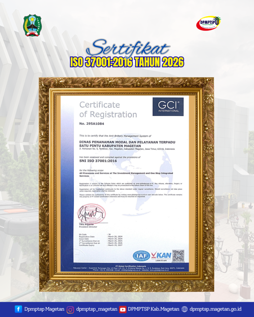 Selain itu, pada Tahun 2026, DPMPTSP Kabupaten Magetan juga berhasil mempertahankan Sertifikasi SNI ISO 37001:2016 tentang Sistem Manajemen Anti Penyuapan (SMAP) yang diterbitkan oleh lembaga sertifikasi internasional GCI International. Sertifikasi ini menegaskan komitmen DPMPTSP Kabupaten Magetan dalam menerapkan sistem pencegahan penyuapan secara konsisten di seluruh proses dan layanan perizinan.